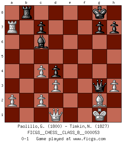 Last move : 0-1 2008 September 24 21:50:8 [Event "FICGS__CHESS__CLASS_B__000053"] [Site "FICGS"] [Date "2008.08.21"] [Round "1"] [White "Paolillo,Giampiero"] [Black "Timkin,Nikolay"] [Result "0-1"] [WhiteElo "1800"] [BlackElo "1827"] 1.e4 e5 2.Nc3 Nf6 3.f4 d5 4.fxe5 Nxe4 5.Qe2 Nc6 6.Nf3 Bf5 7.d3 Nxc3 8.bxc3 d4 9.c4 Bc5 10.h3 Bb4+ 11.Bd2 Bxd2+ 12.Qxd2 O-O 13.g4 Bd7 14.Bg2 f5 15.gxf5 Rxf5 16.O-O Qe7 17.Rab1 Raf8 18.Rxb7 Nxe5 19.Nxe5 Rxf1+ 20.Bxf1 Qxe5 21.Bg2 Qg3 22.Rxa7 Rb8 23.Qd1 Bc6 0-1 Vienna gambit Kingside Castling by player Black (move 12) Kingside Castling by player White (move 16) Player Black won this chess game. Follow this game move after move (download)Becoming successful at Chess allows you to discover your own personality. That's what I want for the kids I teach. (Saudin Robovic) Wie kann ich Remis annehmen? Ich weiß ja gar nicht, wie ich stehe! (Fritz Sämisch) En la perfecta combinación de Ajedrez como en una historia corta de primera clase, toda la trama y contra trama deberá conducir hacia un final sorprendente, el interes no es mitigado hasta el último momento. (Yates and Winter) Le temps de noter son nom sur la feuille de partie, j'étais déjà en zeitnot ! D'un modeste amateur apparié lors de la première ronde d'un open contre le grand-maître Azmaïparashvili. But they are useless. They can only give you answers. (Pablo Picasso, about computers)