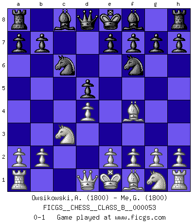 Last move : 0-1 2008 October 16 23:39:26 [Event "FICGS__CHESS__CLASS_B__000053"] [Site "FICGS"] [Date "2008.08.21"] [Round "1"] [White "Owsikowski,Andrzej"] [Black "Me,Gianantonio"] [Result "0-1"] [WhiteElo "1800"] [BlackElo "1800"] 1.d4 d5 2.c4 c6 3.cxd5 cxd5 4.Nc3 Nf6 5.Bf4 Nc6 0-1 This chess game has been lost on time (started : 2008.08.21 1:26:12) QGD Slav defense : Exchange variation Player Black won this chess game. Follow this game move after move (download)Modern Chess is too much concerned with things like Pawn structure. Forget it, Checkmate ends the game. (Nigel Short) Woher wissen wir, daß der Neanderthaler Blindschach gespielt hat? -- Bei Ausgrabungen wurden keine Schachbretter und Figuren gefunden. (Anonymous) Durante una competencia de Ajedrez, un Maestro de Ajedrez deberá ser una combinación de presa de caza y un Monge. (Alexander Alekhine) Le génie consiste à savoir transgresser les règles au moment opportun. (Teichmann) True nature is revealed in times of difficulty. (Chinese proverb)