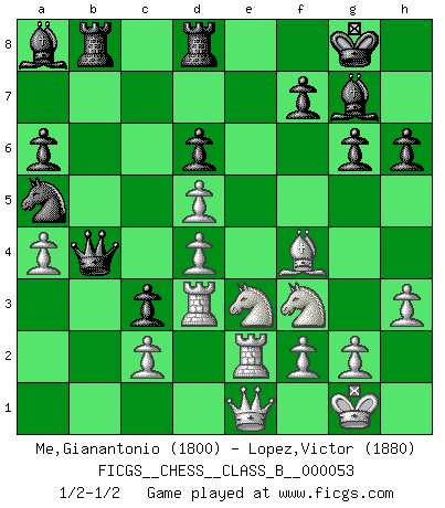 Last move : 1/2-1/2 2009 March 6 21:35:58 [Event "FICGS__CHESS__CLASS_B__000053"] [Site "FICGS"] [Date "2008.08.21"] [Round "1"] [White "Me,Gianantonio"] [Black "Lopez,Victor"] [Result "1/2-1/2"] [WhiteElo "1800"] [BlackElo "1880"] 1.e4 e5 2.Nf3 Nc6 3.Bb5 a6 4.Ba4 Nf6 5.d3 b5 6.Bb3 Be7 7.a4 Rb8 8.O-O b4 9.Bd5 Nxd5 10.exd5 Na5 11.Nxe5 d6 12.Nf3 O-O 13.Nbd2 c5 14.Re1 Bb7 15.Nc4 Bf6 16.Ne3 Qd7 17.h3 Ba8 18.d4 c4 19.Bd2 g6 20.Re2 Bg7 21.Qe1 Qb7 22.Ng4 c3 23.bxc3 bxc3 24.Bf4 Qb4 25.Ne3 Rfd8 26.Rd1 h6 27.Rd3 1/2-1/2 Ruy Lopez : Anderssen variation Kingside Castling by player White (move 8) Kingside Castling by player Black (move 12) This chess game ended in a draw. Follow this game move after move (download)Up to this point White has been following well-known analysis. But now he makes a fatal error: he begins to use his own head. (Siegbert Tarrasch) Es gibt Leute, die glauben, alles wäre vernünftig, was man mit einem ernsthaften Gesicht tut. (Georg Christoph Lichtenberg) El sobresalir en el Ajedrez es un signo de una mente intrigante. (Sir Arthur Conan Doyle) On n'a jamais que l'âge auquel on a commence à jouer aux échecs car après on cesse de vieillir. (Capablanca) Looking at the proliferation of personal web pages on the Net, it looks like very soon everyone on Earth will have 15 megabytes of fame. (M.G. Sriram)