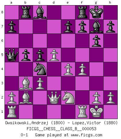 Last move : 0-1 2008 December 1 22:37:10 [Event "FICGS__CHESS__CLASS_B__000053"] [Site "FICGS"] [Date "2008.08.21"] [Round "1"] [White "Owsikowski,Andrzej"] [Black "Lopez,Victor"] [Result "0-1"] [WhiteElo "1800"] [BlackElo "1880"] 1.d4 Nf6 2.c4 g6 3.Nc3 d5 4.cxd5 Nxd5 5.e4 Nxc3 6.bxc3 c5 7.Qd2 Bg7 8.Bb2 O-O 9.Bc4 Qa5 10.Ne2 Nc6 11.d5 Ne5 12.Bb3 b5 13.O-O Rb8 14.f4 Nc4 0-1 This chess game has been lost on time (started : 2008.08.21 1:26:12) King's Indian defense, 3.Nc3 Kingside Castling by player Black (move 8) Kingside Castling by player White (move 13) Player Black won this chess game. Follow this game move after move (download)Chess is 99 percent tactics. (Teichmann) Dieses schreckliche Gefühl, dass ich gegen eine Maschine spielte, die niemals Fehler macht, zerschmetterte meinen Widerstand. (Mark Taimanov) El jugador blanco perdió porque fallo en recordar la coreccta continuación y tuvo que pensar por sí mismo las movidas. (Siegbert Tarrasch) Je menace de comprendre la position. (Anonyme) The good fighters of old first put themselves beyond the possibility of defeat, and then waited for an opportunity of defeating the enemy. (Sun Tzu)