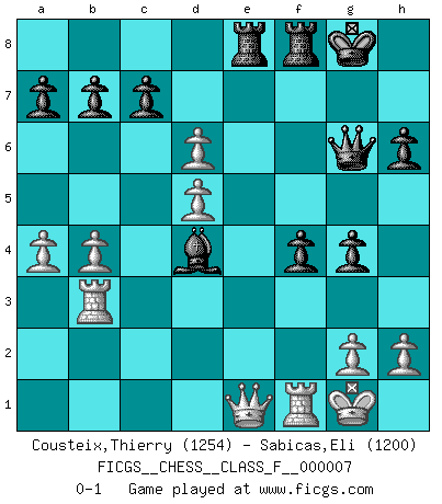 Last move : 0-1 2006 November 14 12:59:19 [Event "FICGS__CHESS__CLASS_F__000007"] [Site "FICGS"] [Date "2006.08.02"] [Round "1"] [White "Cousteix,Thierry"] [Black "Sabicas,Eli"] [Result "0-1"] [WhiteElo "1254"] [BlackElo "1200"] 1.c4 Nf6 2.d4 g6 3.Nc3 Bg7 4.e4 d6 5.Nf3 O-O 6.Be2 Nc6 7.O-O e5 8.d5 Ne7 9.Bg5 h6 10.Bxf6 Bxf6 11.b4 Bg7 12.Nd2 f5 13.f4 exf4 14.Rb1 g5 15.Rf3 g4 16.Rf1 Bxc3 17.Rb3 Be5 18.Qe1 fxe4 19.Nxe4 Ng6 20.a4 Bf5 21.Bd3 Bxe4 22.Bxe4 Qg5 23.Bxg6 Qxg6 24.c5 Rae8 25.cxd6 Bd4+ 0-1 English, 1...Nf6 (Anglo-Indian defense) Kingside Castling by player Black (move 5) Kingside Castling by player White (move 7) Player Black won this chess game. Follow this game move after move (download)Your body has to be in top condition. Your Chess deteriorates as your body does. You can't separate body from mind. (Bobby Fischer) Mit Schach schule ich mein Gefühl für Geometrie, was für Tennis und Schach gleichermaßen wichtig ist. (Boris Becker) Vive, pierde y aprende al observar a tu oponente como ganar. (Amber Steenbock) On n'a jamais que l'âge auquel on a commence à jouer aux échecs car après on cesse de vieillir. (Capablanca) Knowledge rests not upon truth alone, but upon error also. (Carl G. Jung)