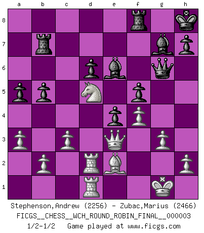 Last move : 1/2-1/2 2008 December 22 13:7:35 [Event "FICGS__CHESS__WCH_ROUND_ROBIN_FINAL__000003"] [Site "FICGS"] [Date "2008.08.22"] [Round "1"] [White "Stephenson,Andrew"] [Black "Zubac,Marius"] [Result "1/2-1/2"] [WhiteElo "2256"] [BlackElo "2466"] 1.e4 c5 2.Nf3 Nc6 3.d4 cxd4 4.Nxd4 Nf6 5.Nc3 e5 6.Ndb5 d6 7.Bg5 a6 8.Na3 b5 9.Bxf6 gxf6 10.Nd5 f5 11.c3 Bg7 12.exf5 Bxf5 13.Nc2 O-O 14.Be2 Be6 15.O-O Rb8 16.Ncb4 Nxb4 17.Nxb4 Rb6 18.Nd5 Rb7 19.Qd2 a5 20.Rfd1 e4 21.a3 Kh8 22.Qe3 f5 23.Rd2 Qh4 24.g3 Qh6 25.f4 Qg6 26.Rad1 1/2-1/2 Sicilian : Pelikan (Lasker/Sveshnikov) variation Kingside Castling by player Black (move 13) Kingside Castling by player White (move 15) This chess game ended in a draw. Follow this game move after move (download)The older I grow, the more I value Pawns. (Keres) Alle offensichtlichen Züge sehen nach dem Spiel in der Analyse verdächtig aus. (Viktor Kortschnoi) Combinaciones deslumbrantes son para la mayoría, mover madera es para los pocos. (Georg Kieninger) Le joueur d'Echecs qui veut atteindre le top est obligé de développer son propre credo créatif. Alexeï Stepanovicth Souétine. Il est facile d'écrire des livres ! Ce qui est difficile, c'est de jouer ! (Alexeï Stepanovicth Souétine) Just because you do not take an interest in politics doesn't mean politics won't take an interest in you. (Pericles 430 B.C.)
