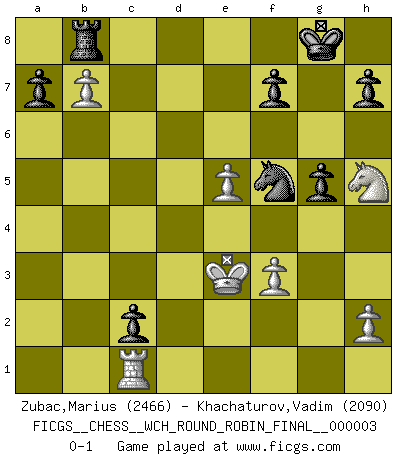 Last move : 0-1 2008 November 28 20:38:14 [Event "FICGS__CHESS__WCH_ROUND_ROBIN_FINAL__000003"] [Site "FICGS"] [Date "2008.08.22"] [Round "1"] [White "Zubac,Marius"] [Black "Khachaturov,Vadim"] [Result "0-1"] [WhiteElo "2466"] [BlackElo "2090"] 1.d4 Nf6 2.c4 e6 3.Nc3 Bb4 4.f3 d5 5.a3 Bxc3+ 6.bxc3 c5 7.cxd5 Nxd5 8.dxc5 Qa5 9.e4 Nf6 10.Be3 O-O 11.Qb3 Nfd7 12.a4 Qc7 13.Qa3 b6 14.a5 bxc5 15.Nh3 Ba6 16.Bxa6 Nxa6 17.O-O c4 18.Qa4 Rab8 19.Rfd1 Ne5 20.Bf4 Rfc8 21.Rd4 Nxf3+ 22.gxf3 e5 23.Qd7 exf4 24.Qxc7 Nxc7 25.Nxf4 Nb5 26.Rd7 Nxc3 27.a6 g5 28.Nh5 Nb5 29.e5 Rd8 30.Rb7 Nd4 31.Kf2 c3 32.Rg1 Rxb7 33.axb7 c2 34.Rc1 Rb8 35.Ke3 Nf5+ 0-1 Nimzo-Indian : Kmoch variation Kingside Castling by player Black (move 10) Kingside Castling by player White (move 17) Player Black won this chess game. Follow this game move after move (download)All that matters on the Chessboard is good moves. (Bobby Fischer) Im Blitz ist es einfacher mit einer Figur weniger anzugreifen, als sich mit einer Mehrfigur zu verteidigen. (Mikhail Nekhemyevich Tal) Si pudieramos observar el interior de la cabeza de un jugador de Ajedrez, encontraríamos ahí un mundo lleno de sentimientos, imágenes, ideas, emoción y pasión. (Alfred Binet) Le plus grand jeu de l'esprit jamais inventé, plus vous l'apprenez, plus vous y prenez du plaisir. (Garry Kasparov) The Movers & Shakers of this world are those who play chess in the mornings and go to the disco in the evenings. (Dinesh De Silva)