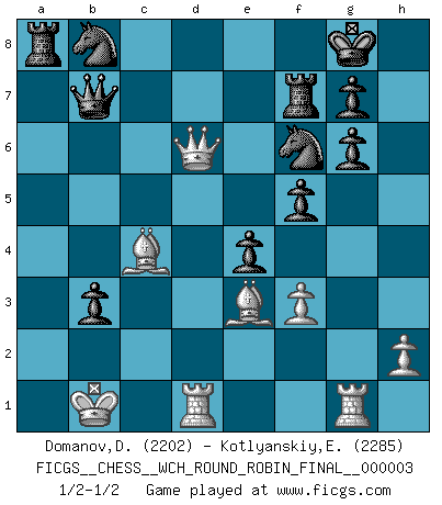 Last move : 1/2-1/2 2008 October 26 10:14:55 [Event "FICGS__CHESS__WCH_ROUND_ROBIN_FINAL__000003"] [Site "FICGS"] [Date "2008.08.22"] [Round "1"] [White "Domanov,Dmitry"] [Black "Kotlyanskiy,Edward"] [Result "1/2-1/2"] [WhiteElo "2202"] [BlackElo "2285"] 1.e4 c5 2.Nf3 d6 3.d4 cxd4 4.Nxd4 Nf6 5.Nc3 a6 6.Be3 e5 7.Nb3 Be6 8.f3 Be7 9.Qd2 O-O 10.O-O-O Nbd7 11.g4 b5 12.g5 Nh5 13.Nd5 Bxd5 14.exd5 f6 15.g6 hxg6 16.Na5 Qe8 17.Nc6 f5 18.Kb1 Nb8 19.Nxe5 dxe5 20.d6 Nf6 21.dxe7 Qxe7 22.c4 Qf7 23.Qd6 e4 24.b3 Qb7 25.cxb5 axb5 26.a4 bxa4 27.Bc4+ Rf7 28.Rhg1 axb3 1/2-1/2 Sicilian : Najdorf, Byrne (English) attack Kingside Castling by player Black (move 9) Queenside Castling by player White (move 10) This chess game ended in a draw. Follow this game move after move (download)When you don't know what to play, wait for an idea to come into your opponent's mind. You may be sure that idea will be wrong. (Siegbert Tarrasch) Fischer: 'Remis!?' Uhlmann: 'Aber es muss doch dreimal Zugwiederholung sein!' Fischer: 'Sie nehmen das Remis an, wie ich es sage, sonst spiele ich weiter und werde Sie dann schlagen!' (Robert James Fischer) Bobby Fischer es el mas grande genio de Ajedrez de todos los tiempos. (Alexander Kotov) On est toujours la mazette de quelqu'un d'autre. (Anonyme) Logic : The art of thinking and reasoning in strict accordance with the limitations and incapacities of the human misunderstanding. (Ambrose Bierce)