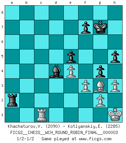 Last move : 1/2-1/2 2008 October 12 2:35:34 [Event "FICGS__CHESS__WCH_ROUND_ROBIN_FINAL__000003"] [Site "FICGS"] [Date "2008.08.22"] [Round "1"] [White "Khachaturov,Vadim"] [Black "Kotlyanskiy,Edward"] [Result "1/2-1/2"] [WhiteElo "2090"] [BlackElo "2285"] 1.d4 d5 2.c4 c6 3.Nf3 Nf6 4.e3 e6 5.Bd3 Nbd7 6.O-O dxc4 7.Bxc4 Bd6 8.Nc3 O-O 9.e4 e5 10.Bg5 Qe7 11.Re1 Rd8 12.d5 Nb6 13.Bb3 h6 14.Bh4 Bg4 15.h3 Bh5 16.Qe2 a5 17.Qe3 Nbd7 18.dxc6 bxc6 19.Na4 g5 20.Bg3 Nc5 21.Nxc5 Bxc5 22.Qc3 Bxf3 23.Qxf3 Bd4 24.Rab1 a4 25.Bc4 Ne8 26.b4 axb3 27.Bxb3 Qf6 28.Qe2 Nd6 29.Rbc1 c5 30.Kh1 Rdc8 31.Rc2 Kg7 32.Bd5 Ra5 33.Qd2 Ra4 34.Rec1 c4 35.f3 h5 36.Qe2 Ra3 37.Bxc4 Nxc4 38.Rxc4 Rxc4 39.Qxc4 g4 40.Qc6 Qe7 41.Qc7 Qxc7 42.Rxc7 Rxa2 43.Rc1 1/2-1/2 QGD Slav : 4.e3 Kingside Castling by player White (move 6) Kingside Castling by player Black (move 8) This chess game ended in a draw. Follow this game move after move (download)Chess is no whit inferior to the violin, and we have a large number of professional violinists. (Mikhail Botvinnik) Gewöhnliche Menschen denken nur daran, wie sie ihre Zeit verbringen. Ein intelligenter Mensch versucht, sie auszunutzen. (Arthur Schopenhauer) En un gambito tu regalas un Peón por el bién de tomar un juego perdido. (Samuel Standige Boden) Celui qui prend des risques peut perdre, celui qui n'en prend pas perd toujours. (Xavier Tartacover) There are three kinds of lies: lies, damned lies and statistics. (Mark Twain)