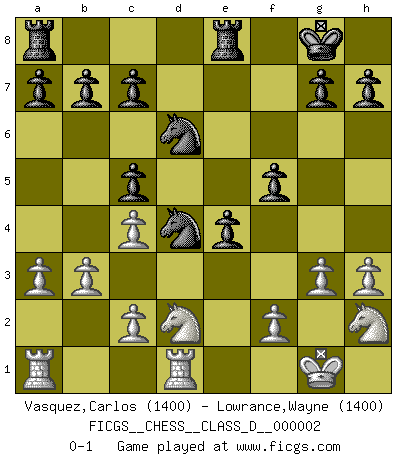 Last move : 0-1 2006 May 24 1:6:17 [Event "FICGS__CHESS__CLASS_D__000002"] [Site "FICGS"] [Date "2006.04.15"] [Round "1"] [White "Vasquez,Carlos"] [Black "Lowrance,Wayne"] [Result "0-1"] [WhiteElo "1400"] [BlackElo "1400"] 1.e4 e5 2.Nf3 Nc6 3.Bc4 Bc5 4.d3 Nf6 5.a3 d6 6.h3 O-O 7.O-O Be6 8.Be3 Bxc4 9.Bxc5 dxc5 10.dxc4 Nxe4 11.Re1 Qxd1 12.Rxd1 Rfe8 13.Nbd2 Nd6 14.b3 e4 15.Nh2 f5 16.g3 Nd4 0-1 Giuoco Pianissimo Kingside Castling by player Black (move 6) Kingside Castling by player White (move 7) Player Black won this chess game. Follow this game move after move (download)It is not enough to be a good player... you must also play well. (Siegbert Tarrasch) Wenn Dein Gegner dir ein Remis anbietet, versuch herauszufinden, weshalb er glaubt schlechter zu stehen. (Nigel Short) El sobresalir en el Ajedrez es un signo de una mente intrigante. (Sir Arthur Conan Doyle) Le temps de noter son nom sur la feuille de partie, j'étais déjà en zeitnot ! D'un modeste amateur apparié lors de la première ronde d'un open contre le grand-maître Azmaïparashvili. But they are useless. They can only give you answers. (Pablo Picasso, about computers)