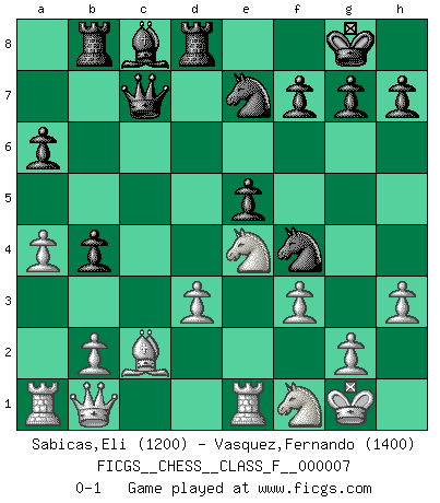 Last move : 0-1 2007 January 20 18:47:53 [Event "FICGS__CHESS__CLASS_F__000007"] [Site "FICGS"] [Date "2006.08.02"] [Round "1"] [White "Sabicas,Eli"] [Black "Vasquez,Fernando"] [Result "0-1"] [WhiteElo "1200"] [BlackElo "1400"] 1.e4 e5 2.Nf3 d6 3.Bc4 Nc6 4.c3 Nf6 5.d3 Be7 6.O-O O-O 7.h3 Na5 8.Bb5 a6 9.Ba4 b5 10.Bc2 c5 11.Re1 Qc7 12.Nbd2 Nc6 13.Nf1 d5 14.exd5 Nxd5 15.Bg5 Bxg5 16.Nxg5 Nf4 17.Ne4 Ne7 18.f3 Rd8 19.a4 b4 20.Qb1 Rb8 21.cxb4 cxb4 0-1 This chess game has been lost on time (started : 2006.08.02 2:57:13) Philidor's defense Kingside Castling by player White (move 6) Kingside Castling by player Black (move 6) Player Black won this chess game. Follow this game move after move (download)There's never before been a Chess player with such a thorough knowledge of the intricacies of the game and such an absolutely indomitable will to win. I think Bobby is the greatest player that ever lived. (Lisa Lane) Schach ist ein Kampf gegen den Fehler. (Johannes Herrman Zukertort) Dios mío, Bobby Fischer juega tan simple. (Alexei Suetin) Il (Jacob Murray) ne joue pas pour le bon coup, mais pour le meilleur. (Eloi Relange) We need strong personalities and only one world champion to attract sponsors. (Anatoly Karpov)
