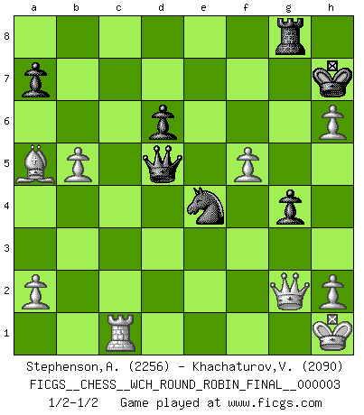 Last move : 1/2-1/2 2008 December 16 20:27:48 [Event "FICGS__CHESS__WCH_ROUND_ROBIN_FINAL__000003"] [Site "FICGS"] [Date "2008.08.22"] [Round "1"] [White "Stephenson,Andrew"] [Black "Khachaturov,Vadim"] [Result "1/2-1/2"] [WhiteElo "2256"] [BlackElo "2090"] 1.d4 Nf6 2.c4 g6 3.Nc3 Bg7 4.e4 d6 5.Nf3 O-O 6.Be2 e5 7.O-O Nc6 8.d5 Ne7 9.b4 Nh5 10.Re1 f5 11.Ng5 Nf6 12.f3 Kh8 13.Ne6 Bxe6 14.dxe6 Nh5 15.g3 Bf6 16.exf5 Nxf5 17.g4 e4 18.Nxe4 Bxa1 19.Bg5 Bd4+ 20.Kh1 Qe8 21.e7 Nxe7 22.Qxd4+ Ng7 23.b5 Ng8 24.Bd2 Qf7 25.Bc3 h6 26.f4 Rae8 27.Rf1 Nf6 28.Bf3 Nxe4 29.Bxe4 Kh7 30.Bxb7 Ne6 31.Qd2 Nc5 32.Bd5 Qe7 33.Ba5 Ne4 34.Qg2 Nf6 35.Bc6 Qe6 36.Bxe8 Rxe8 37.g5 Ne4 38.gxh6 Qxc4 39.Rg1 Rg8 40.Bxc7 Qd5 41.Rc1 g5 42.f5 g4 43.Ba5 1/2-1/2 King's Indian : Orthodox, Aronin-Taimanov variation (Yugoslav attack / Mar del Plata variation) Kingside Castling by player Black (move 5) Kingside Castling by player White (move 7) This chess game ended in a draw. Follow this game move after move (download)Examine moves that smite! A good eye for smites is far more important than a knowledge of strategical principles. (Purdy) Mein Gehirn das ist mein zweitwichtigstes Organ [Aus dem Film: Der Schläfer]. (Woody Allen) Una victoria por una combinación errónea, aunque sea espectacular, me llena de horror artístico. (Wilhelm Steinitz) J'ai toujours senti une vague pitié pour l'homme qui ne connaît rien aux échecs, tout comme j'en aurais pour un homme ignorant de l'amour. Les Echecs, comme la musique ou comme l'amour, ont le pouvoir de rendre heureux. (Siegbert Tarrasch) Live, lose, and learn, by observing your opponent how to win. (Amber Steenbock)