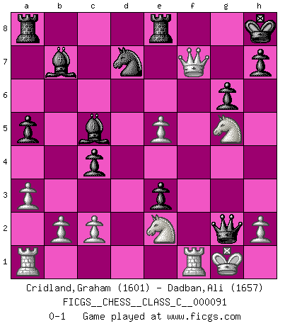 Last move : 0-1 2008 September 30 19:10:46 [Event "FICGS__CHESS__CLASS_C__000091"] [Site "FICGS"] [Date "2008.08.23"] [Round "1"] [White "Cridland,Graham"] [Black "Dadban,Ali"] [Result "0-1"] [WhiteElo "1601"] [BlackElo "1657"] 1.e4 d6 2.d4 Nf6 3.Nc3 g6 4.Be3 c6 5.Qd2 b5 6.f3 Bb7 7.Nge2 Nbd7 8.a3 Nb6 9.Nc1 Qc7 10.Nb3 Nc4 11.Bxc4 bxc4 12.Nc1 Bg7 13.N1e2 O-O 14.O-O d5 15.e5 Nd7 16.Bg5 e6 17.Be7 Rfe8 18.Bd6 Qc8 19.Nf4 c5 20.Nce2 cxd4 21.Qxd4 f6 22.exf6 Bxf6 23.Qf2 e5 24.Nh3 Qc6 25.Bb4 a5 26.Bd2 Be7 27.f4 Bc5 28.Be3 d4 29.fxe5 dxe3 30.Qf7+ Kh8 31.Ng5 Qxg2+ 0-1 Pirc : 150 attack Kingside Castling by player Black (move 13) Kingside Castling by player White (move 14) Player Black won this chess game. Follow this game move after move (download)We must make sure that Chess will not be like a dead language, very interesting, but for a very small group. (Sytze Faber) Drei Punkte vor allen anderen ist wie einer, der im weißen Anzug posiert, während der Rest in Müllsäcke gekleidet dasteht. (Viktor Kortschnoi) No es suficiente ser un buen jugador, se debe también de jugar bién. (Siegbert Tarrasch) Le plus grand jeu de l'esprit jamais inventé, plus vous l'apprenez, plus vous y prenez du plaisir. (Garry Kasparov) If you are good, you will be assigned all the work. If you are really good, you will get out of it. (Dan Rotaru)
