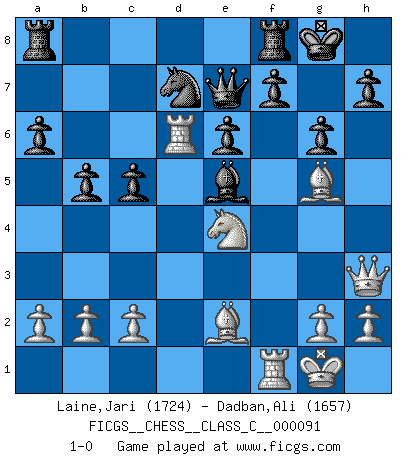 Last move : 1-0 2008 September 29 9:52:27 [Event "FICGS__CHESS__CLASS_C__000091"] [Site "FICGS"] [Date "2008.08.23"] [Round "1"] [White "Laine,Jari"] [Black "Dadban,Ali"] [Result "1-0"] [WhiteElo "1724"] [BlackElo "1657"] 1.e4 d6 2.d4 Nf6 3.Nc3 g6 4.f4 Bg7 5.Nf3 O-O 6.Be3 b6 7.e5 Nfd7 8.Ng5 dxe5 9.dxe5 e6 10.Qf3 c6 11.Rd1 Bb7 12.Be2 Qe7 13.O-O a6 14.Nge4 c5 15.Qh3 b5 16.Nd6 Bc6 17.Nce4 Bxe4 18.Nxe4 Nc6 19.Rd6 Ncxe5 20.fxe5 Bxe5 21.Bg5 1-0 Pirc : Austrian attack, 6.Be3 Kingside Castling by player Black (move 5) Kingside Castling by player White (move 13) Player White won this chess game. Follow this game move after move (download)Chess, like any creative activity, can exist only through the combined efforts of those who have creative talent, and those who have the ability to organize their creative work. (Mikhail Botvinnik) Ihnen, Herr Lasker, habe ich nur drei Worte zu sagen: Schach und matt. (Siegbert Tarrasch) El sobresalir en el Ajedrez es un signo de una mente intrigante. (Sir Arthur Conan Doyle) La guerre est enfant de la passion, la passion est enfant du narcissisme et le narcissisme est l'enfant. (...) Une autre partie ? (Thibault de Vassal) I've lost money so fast in these clubs it's left me reeling. I've read every poker book ever written, but the only way to get better at the game is to go out and play with people who are really good. The problem is, you stand to lose a lot of money doing it. (Matt Damon)