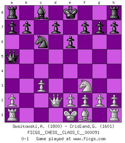 Last move : 0-1 2008 November 26 22:0:52 [Event "FICGS__CHESS__CLASS_C__000091"] [Site "FICGS"] [Date "2008.08.23"] [Round "1"] [White "Owsikowski,Andrzej"] [Black "Cridland,Graham"] [Result "0-1"] [WhiteElo "1800"] [BlackElo "1601"] 1.d4 Nf6 2.c4 c6 3.d5 e6 4.Nc3 cxd5 5.cxd5 Bb4 6.Nf3 Nxd5 7.Bd2 Nxc3 8.Bxc3 Bxc3+ 9.bxc3 Qa5 10.Qd2 Nc6 0-1 This chess game has been lost on time (started : 2008.08.23 10:46:35) Queen's pawn game Player Black won this chess game. Follow this game move after move (download)The enormous mental resilience, without which no Chess player can exist, was so much taken up by Chess that he could never free his mind of this game. (Albert Einstein) Ich verlor meine Bürgerrechte, mein Gehalt wurde mir nicht mehr bezahlt und ich wurde zensiert und durfte nicht mehr ins Ausland reisen. [nach dem Match Fischer-Taimanov 6:0] (Mark Taimanov) No solamente yo pronostico su triunfo sobre Botvinnik, sino que me adelanto y digo que probablemente Fischer es el jugador de Ajedrez mas grande que haya existido. (John Collins) Celui qui prend des risques peut perdre, celui qui n'en prend pas perd toujours. (Xavier Tartacover) However beautiful the strategy, you should occasionally look at the results. (Winston Churchill)