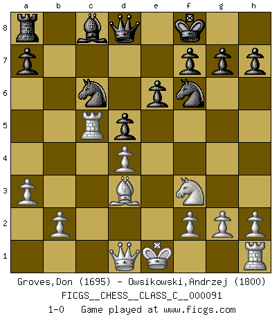 Last move : 1-0 2008 November 20 21:37:28 [Event "FICGS__CHESS__CLASS_C__000091"] [Site "FICGS"] [Date "2008.08.23"] [Round "1"] [White "Groves,Don"] [Black "Owsikowski,Andrzej"] [Result "1-0"] [WhiteElo "1695"] [BlackElo "1800"] 1.e4 c6 2.d4 d5 3.exd5 cxd5 4.c4 e6 5.Nf3 Bb4+ 6.Bd2 Qe7 7.Nc3 Nf6 8.a3 Bxc3 9.Bxc3 O-O 10.Bb4 Qd8 11.Bxf8 Kxf8 12.c5 Nc6 13.Bd3 b6 14.Rc1 bxc5 15.Rxc5 1-0 This chess game has been lost on time (started : 2008.08.23 10:46:35) Caro-Kann : Panov-Botvinnik attack Kingside Castling by player Black (move 9) Player White won this chess game. Follow this game move after move (download)Chess is a fighting game which is purely intellectual and includes chance. (Richard Reti) Alles was ich jemals tun will ist Schach spielen. (Robert James Fischer) Por esta medida (el intervalo entre Fischer y sus contemporaneos), yo le considero el mas grande campeón mundial. (Garry Kasparov) Le système Elo représente seulement une moyenne. Il est simplement un indicateur de votre stabilité. (Anatoli Karpov) Philosophers use a language that is already deformed as though by shoes that are too tight. (Ludwig Wittgenstein)