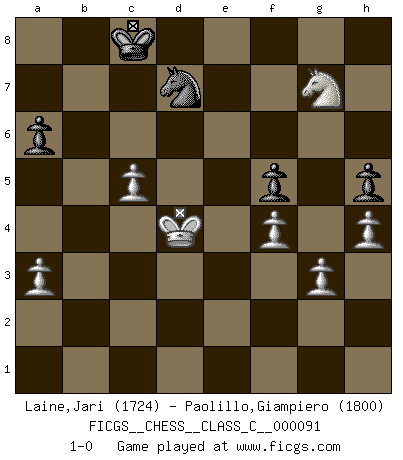 Last move : 1-0 2009 March 10 11:19:14 [Event "FICGS__CHESS__CLASS_C__000091"] [Site "FICGS"] [Date "2008.08.23"] [Round "1"] [White "Laine,Jari"] [Black "Paolillo,Giampiero"] [Result "1-0"] [WhiteElo "1724"] [BlackElo "1800"] 1.e4 e6 2.d4 d5 3.Nd2 c5 4.exd5 exd5 5.Ngf3 Nc6 6.Bb5 Bd6 7.dxc5 Bxc5 8.O-O Nge7 9.Nb3 Bb6 10.Re1 O-O 11.Be3 Bxe3 12.Rxe3 a6 13.Bd3 Bf5 14.c3 Qc7 15.Qc2 Bxd3 16.Qxd3 Rad8 17.Rae1 Ng6 18.Qf5 Na5 19.Nxa5 Qxa5 20.a3 Qb5 21.R1e2 Qd7 22.Nd4 Qxf5 23.Nxf5 Rd7 24.g3 h6 25.f4 h5 26.h4 f6 27.Re6 R8f7 28.Kf2 Kh7 29.Re8 Rc7 30.Ke3 Rfd7 31.Kd3 Rf7 32.Rd8 Rfd7 33.Rxd7 Rxd7 34.Kd4 Kg8 35.Kc5 Kf8 36.Re6 Kf7 37.Rd6 Nf8 38.Kxd5 Rc7 39.Rd8 Kg6 40.Nd6 Nd7 41.Kd4 Nb6 42.c4 f5 43.b3 Kf6 44.c5 Nd7 45.b4 b6 46.Ne8+ Ke7 47.Nxc7 Kxd8 48.Ne6+ Kc8 49.Nxg7 bxc5+ 50.bxc5 1-0 French : Tarrasch, Open variation, Main line Kingside Castling by player White (move 8) Kingside Castling by player Black (move 10) Player White won this chess game. Follow this game move after move (download)You sit at the board and suddenly your heart leaps. Your hand trembles to pick up the piece and move it. But what Chess teaches you is that you must sit there calmly and think about whether it's really a good idea and whether there are other better ideas. (Stanley Kubrick) Moralische Siege zählen nicht. (Savielly Grigorievitsch Tartakower) Cuando me preguntan: -¿Cual es el secreto que te hace hacer mejores movidas que tus oponentes?, Yo respondo: Me da gusto que me pregunten eso, porque, como veran, hay una simple razón. Yo pienso mis propias movidas y dejo a mi oponente que el piense las suyas. (Alexander Alekhine) Les sacrifices démontrent seulement que quelqu'un a gaffé. (Savielly Tartacover) Fame, I have already. Now I need the money. (an elderly Steinitz)