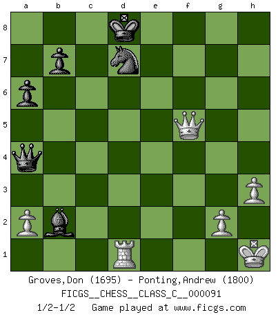Last move : 1/2-1/2 2008 September 13 0:2:35 [Event "FICGS__CHESS__CLASS_C__000091"] [Site "FICGS"] [Date "2008.08.23"] [Round "1"] [White "Groves,Don"] [Black "Ponting,Andrew"] [Result "1/2-1/2"] [WhiteElo "1695"] [BlackElo "1800"] 1.e4 c5 2.c3 Nf6 3.e5 Nd5 4.Nf3 Nc6 5.d4 cxd4 6.cxd4 d6 7.Bc4 Nb6 8.Bb5 dxe5 9.Nxe5 Bd7 10.Nxd7 Qxd7 11.Nc3 Rd8 12.Be3 e6 13.O-O Be7 14.Qf3 a6 15.Be2 O-O 16.Rad1 Bf6 17.Bd3 Nxd4 18.Bxh7+ Kxh7 19.Qh5+ Kg8 20.Ne4 Be5 21.Ng5 Rfe8 22.f4 Bf6 23.Qh7+ Kf8 24.Qh5 Kg8 25.Bxd4 Bxd4+ 26.Kh1 Qc7 27.f5 exf5 28.Qh7+ Kf8 29.Qh8+ Ke7 30.Rfe1+ Be5 31.Qxg7 Rxd1 32.Qxf7+ Kd8 33.Rxd1+ Nd7 34.Ne6+ Rxe6 35.Qxe6 Bxb2 36.Qxf5 Qc6 37.h3 Qa4 1/2-1/2 Sicilian : Alapin's variation (2.c3) Kingside Castling by player White (move 13) Kingside Castling by player Black (move 15) This chess game ended in a draw. Follow this game move after move (download)Chess opens and enriches your mind. (Saudin Robovic) Fischer: 'Remis!?' Uhlmann: 'Aber es muss doch dreimal Zugwiederholung sein!' Fischer: 'Sie nehmen das Remis an, wie ich es sage, sonst spiele ich weiter und werde Sie dann schlagen!' (Robert James Fischer) Jugadores de primera clase pierden en contra de jugadores de segunda clase porque los jugadores de segunda clase a veces juegan una partida de primer clase. (Siegbert Tarrasch) Mais l'homme est une créature légère et illogique : semblable au joueur d'échecs, il n'aime que le processus du but à atteindre, non le but lui-même. (Dostoïevsky) Hold em is to stud what chess is to checkers. (Johnny Moss)