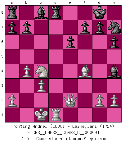 Last move : 1-0 2008 November 2 8:9:55 [Event "FICGS__CHESS__CLASS_C__000091"] [Site "FICGS"] [Date "2008.08.23"] [Round "1"] [White "Ponting,Andrew"] [Black "Laine,Jari"] [Result "1-0"] [WhiteElo "1800"] [BlackElo "1724"] 1.e4 c6 2.d4 d5 3.Nc3 dxe4 4.Nxe4 Nd7 5.Ng5 Ngf6 6.Bd3 e6 7.N1f3 Bd6 8.Qe2 h6 9.Ne4 Nxe4 10.Bxe4 Nf6 11.Bd3 O-O 12.Bd2 c5 13.dxc5 Bxc5 14.O-O-O Qb6 15.Ne5 Bxf2 16.Nc4 Qc5 17.b4 Qd4 18.c3 Qd8 19.Bf4 Bh4 20.Bh7+ Nxh7 21.Rxd8 Rxd8 22.Rd1 1-0 Caro-Kann : Steinitz variation Kingside Castling by player Black (move 11) Queenside Castling by player White (move 14) Player White won this chess game. Follow this game move after move (download)The older I grow, the more I value pawns. (Paul Keres) Rauchen ist dem Schachspieler bei seiner Arbeit, also im Wettkampf, untersagt. (Viktor Kortschnoi) El Ajedrez es imaginación. (David Bronstein) La victoire dans une partie d'Echecs appartient la plupart du temps à celui qui voit un peu plus loin que l'adversaire. (Lasker) Now be brave and don't look back. Don't look back. (Shmi Skywalker in Star Wars ep.1)