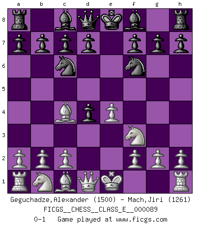 Last move : 0-1 2008 October 16 23:39:26 [Event "FICGS__CHESS__CLASS_E__000089"] [Site "FICGS"] [Date "2008.08.23"] [Round "1"] [White "Geguchadze,Alexander"] [Black "Mach,Jiri"] [Result "0-1"] [WhiteElo "1500"] [BlackElo "1261"] 1.e4 e5 2.d4 exd4 3.Nf3 Nc6 4.Bc4 Nf6 0-1 This chess game has been lost on time (started : 2008.08.23 22:47:9) Centre game Player Black won this chess game. Follow this game move after move (download)Chess is a more highly symbolic game, but the aggressions are therefore even more frankly represented in the play. It probably began as a war game; that is, the representation of a miniature battle between the forces of two kingdoms. (Karl Meninger) Frage: Was machen Sie mit den Preisen? Anwort: Ich habe Angst, dass meine Freundin davon neue Kleider kauft. (Loek van Wely) Bobby es el jugador de Ajedrez mas fino que este país jamás haya producido. Su memoria para las movidas, su brillantez en soñar combinaciones y su feróz determinación por la victoria son algo extraño. (John Collins) 'L'échange des dames est un coup dur pour les deux adversaires...' Un journaliste lors d'une partie du match Spassky-Fischer SEO proverb : Make your website optimized for human beings, not for search engines.
