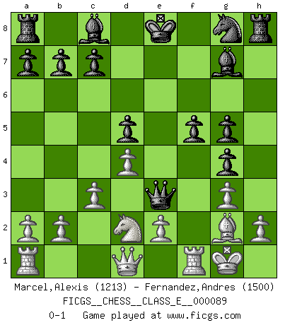 Last move : 0-1 2008 August 31 10:10:15 [Event "FICGS__CHESS__CLASS_E__000089"] [Site "FICGS"] [Date "2008.08.23"] [Round "1"] [White "Marcel,Alexis"] [Black "Fernandez,Andres"] [Result "0-1"] [WhiteElo "1213"] [BlackElo "1500"] 1.f4 e5 2.fxe5 Nc6 3.Nf3 g5 4.g3 g4 5.Nh4 Nxe5 6.Bg2 d5 7.O-O Bg7 8.d4 Ng6 9.Nxg6 hxg6 10.Bf4 g5 11.Be3 f5 12.Nd2 Qe7 13.c3 Qxe3+ 0-1 Bird : From gambit Kingside Castling by player White (move 7) Player Black won this chess game. Follow this game move after move (download)Life is a kind of Chess, with struggle, competition, good and ill events. (Benjamin Franklin) Fischer machte Schach einfach zu einer aufregenden Sache, wann immer er sich ans Brett setzte. (Raymond Keene) Vive, pierde y aprende al observar a tu oponente como gana. (Amber Steenbock) Les Echecs ne sont pas pour les âmes timides. Ils requièrent un homme entier, qui ne s'arrête pas aveuglément à ce qui a été déjà établi, mais qui tente individuellement de sonder les profondeurs du jeu. (W. Steinitz) The greatest con, that he ever pulled... was making you believe... that he is you. (Revolver, movie)