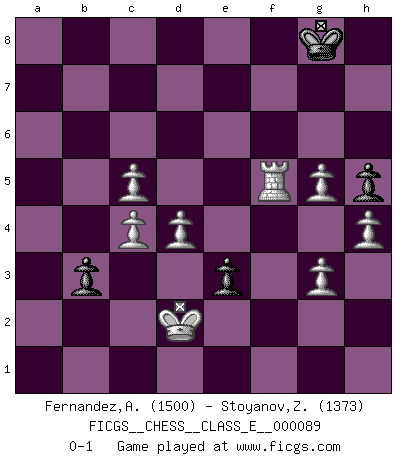 Last move : 0-1 2008 December 14 14:35:39 [Event "FICGS__CHESS__CLASS_E__000089"] [Site "FICGS"] [Date "2008.08.23"] [Round "1"] [White "Fernandez,Andres"] [Black "Stoyanov,Zdravko"] [Result "0-1"] [WhiteElo "1500"] [BlackElo "1373"] 1.Nf3 c6 2.g3 b5 3.Bg2 e6 4.d3 Bb7 5.O-O Be7 6.Nbd2 Nf6 7.e4 h6 8.e5 O-O 9.exf6 Bxf6 10.Ne4 d5 11.Nxf6+ Qxf6 12.Re1 Nd7 13.d4 Rfe8 14.Bf4 c5 15.c3 c4 16.Ne5 Nxe5 17.Bxe5 Qg6 18.Qb1 Qxb1 19.Raxb1 f6 20.Bd6 Rad8 21.Bc5 a6 22.Re3 e5 23.Rbe1 e4 24.b3 cxb3 25.axb3 f5 26.f4 a5 27.Bh3 Bc8 28.Ra1 Bd7 29.Rxa5 g6 30.Ra7 Kf7 31.Bb6 Ke6 32.Bxd8 Rxd8 33.Ra5 g5 34.Bf1 Rb8 35.Kf2 b4 36.c4 Bc6 37.c5 h5 38.fxg5 Kf7 39.h4 Kg7 40.Ra7+ Kg8 41.Ra6 Be8 42.Rd6 Ra8 43.Rxd5 Bg6 44.Bc4 Bf7 45.Rxf5 Ra2+ 46.Re2 Rxe2+ 47.Kxe2 Bxc4+ 48.bxc4 b3 49.Kd2 e3+ 0-1 Reti Opening Kingside Castling by player White (move 5) Kingside Castling by player Black (move 8) Player Black won this chess game. Follow this game move after move (download)Chess is so inspiring that I do not believe a good player is capable of having an evil thought during the game. (Wilhelm Steinitz) Der Knackpunkt bei der Konzentration ist, daß wir nur durch sie etwas Neues und Ungewöhnliches am Schachbrett finden können. Sie ist der einzige Weg durch neue neue Ideen eine Überraschung zu bereiten. (Garry Kasparov) Yo no creo en la psicología. Yo creo en las buenas movidas. (Bobby Fischer) La victoire dans une partie d'Echecs appartient la plupart du temps à celui qui voit un peu plus loin que l'adversaire. (Lasker) The only thing that overcomes hard luck is hard work. (Harry Golden)
