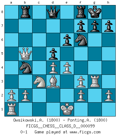 Last move : 0-1 2008 November 25 9:57:13 [Event "FICGS__CHESS__CLASS_D__000099"] [Site "FICGS"] [Date "2008.08.23"] [Round "1"] [White "Owsikowski,Andrzej"] [Black "Ponting,Andrew"] [Result "0-1"] [WhiteElo "1800"] [BlackElo "1800"] 1.d4 d5 2.c4 c6 3.cxd5 cxd5 4.Nc3 Nf6 5.Bf4 Nc6 6.e3 a6 7.Nf3 Bg4 8.Qa4 Bxf3 9.gxf3 e6 10.Bd3 Bd6 11.Bg3 O-O 12.Rg1 Rc8 13.e4 b5 14.Qxa6 Bxg3 15.Rxg3 Nb4 16.Qxb5 Rb8 0-1 This chess game has been lost on time (started : 2008.08.23 22:51:53) QGD Slav defense : Exchange variation Kingside Castling by player Black (move 11) Player Black won this chess game. Follow this game move after move (download)That's what Chess is all about. One day you give your opponent a lesson, the next day he gives you one. (Bobby Fischer) Schach ist ein schwarz-weisser Dschungel. (Garry Kasparov) ¿Cual es el objetivo de jugar una apertura de gambito?... Para adquirir una reputación de ser un jugador apuesto a costo de perder el juego. (Siegbert Tarrasch) Nous vivons dans un monde échiquéen : chaque jour qui passe est un défi à relever. (Philosophe Sasha) The problem with manipulation is that people can turn on you. (Horatio Caine, C.S.I. Miami)