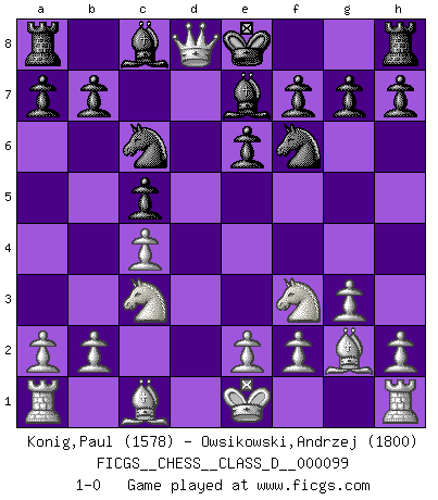 Last move : 1-0 2008 November 4 7:46:40 [Event "FICGS__CHESS__CLASS_D__000099"] [Site "FICGS"] [Date "2008.08.23"] [Round "1"] [White "Konig,Paul"] [Black "Owsikowski,Andrzej"] [Result "1-0"] [WhiteElo "1578"] [BlackElo "1800"] 1.c4 c5 2.Nc3 d6 3.g3 Nc6 4.Bg2 Nf6 5.Nf3 e6 6.d4 Be7 7.dxc5 dxc5 8.Qxd8+ 1-0 This chess game has been lost on time (started : 2008.08.23 22:51:53) English : Symmetrical variation Player White won this chess game. Follow this game move after move (download)A chess genius has died; a loss for humanity. (Viktor Kortchnoi, about Bobby Fischer's death) Er war ein guter Schachspieler, aber ich kann Leute nicht ausstehen, die 'Heil Hitler' rufen (Über Alexander Aljechin). (Miguel Najdorf) Cuando veas una buena jugada, trata de encontrar otra mejor. (Emanuel Lasker) Pour se monter efficace, un Cavalier a besoin d'avant-postes ! Les Cavaliers font les meilleurs bloqueurs de pions passés. Lamb in skin of tiger, still fears the wolf. (Chinese proverb)