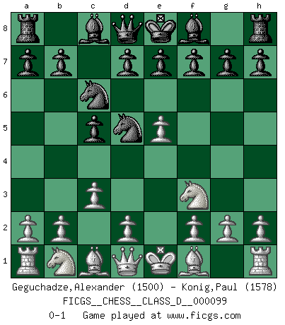 Last move : 0-1 2008 October 13 23:22:30 [Event "FICGS__CHESS__CLASS_D__000099"] [Site "FICGS"] [Date "2008.08.23"] [Round "1"] [White "Geguchadze,Alexander"] [Black "Konig,Paul"] [Result "0-1"] [WhiteElo "1500"] [BlackElo "1578"] 1.e4 c5 2.Nf3 Nc6 3.c3 Nf6 4.e5 Nd5 0-1 This chess game has been lost on time (started : 2008.08.23 22:51:53) Sicilian defense Player Black won this chess game. Follow this game move after move (download)In Fischer's hands, a slight theoretical advantage is as good a being a Queen ahead. (Isaac Kashdan) Ich kenne keine einzige Person, die behaupten würde, Garri Kasparow sei ein guter Mensch (Nigel Short) Prefiero perder una partida realmente buena, que ganar una mala. (David Levy) Il vaut toujours mieux jouer un plan faux de façon logique que de n'avoir pas de plan du tout. (Victor Kortchnoï) There is a computer disease that anybody who works with computers knows about. It's a very serious disease and it interferes completely with the work. The trouble with computers is that you 'play' with them ! (Richard P. Feynman)