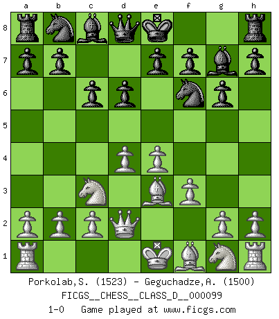 Last move : 1-0 2008 October 21 12:29:13 [Event "FICGS__CHESS__CLASS_D__000099"] [Site "FICGS"] [Date "2008.08.23"] [Round "1"] [White "Porkolab,Sandor"] [Black "Geguchadze,Alexander"] [Result "1-0"] [WhiteElo "1523"] [BlackElo "1500"] 1.e4 d6 2.d4 Nf6 3.Nc3 g6 4.f3 c6 5.Be3 Bg7 6.Qd2 1-0 This chess game has been lost on time (started : 2008.08.23 22:51:53) Pirc defense Player White won this chess game. Follow this game move after move (download)Methodical thinking is of more use in Chess than inspiration. (C. J. S. Purdy) Ein Schachspiel besteht aus drei Phasen: Die erste, wenn du hofftst den Vorteil zu haben, die zweite, wenn du glaubst einen Vorteil zu haben, und die dritte.... wenn du weißt Du wirst verlieren. (Savielly Grigorievitsch Tartakower) El Ajedrez es tortura mental. (Garry Kasparov) Vouloir jouer aux échecs contre soi-même est aussi paradoxal que vouloir marcher sur son ombre. (Stefan Zweig) Watch your thoughts; they become words. Watch your words; they become actions. Watch your actions; they become habits. Watch your habits; they become character. Watch your character; it becomes your destiny. (Frank Outlaw)