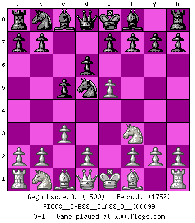 Last move : 0-1 2008 November 7 8:7:4 [Event "FICGS__CHESS__CLASS_D__000099"] [Site "FICGS"] [Date "2008.08.23"] [Round "1"] [White "Geguchadze,Alexander"] [Black "Pech,Jaroslav"] [Result "0-1"] [WhiteElo "1500"] [BlackElo "1752"] 1.e4 c5 2.Nf3 d6 3.c3 Nf6 4.e5 Nd5 0-1 This chess game has been lost on time (started : 2008.08.23 22:51:53) Sicilian Player Black won this chess game. Follow this game move after move (download)I thought the most common mistake [in chess] was the first one: Learning the game :P (Garvin Gray, FICGS forum) Das Zentrum ist der Balkan des Schachbretts - Kriegshandlungen können in jedem Moment ausbrechen. (Aaron Nimzowitsch) Si el Ajedrez es una ciencia, es la mas inexacta. Si el Ajedrez es un arte, es demasiado inexacto para ser visto como tal. Si el Ajedrez es un deporte, es demasiado esotérico. Si el Ajedrez es un juego, es demasiado exigente para ser solo un juego. Si el Ajedrez es una aventura, es una muy demandante. Si el Ajedrez es una pasión, es una muy gratificante. Si el Ajedrez es la vida, es una muy triste. (Anónimo) Les échecs, c'est l'imagination. (David Bronstein) If we knew what we were doing, we would not call it research. (Albert Einstein)