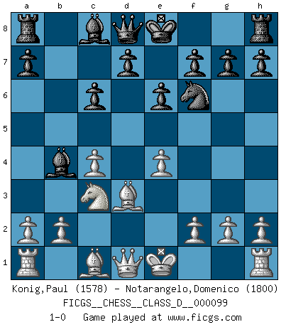 Last move : 1-0 2008 October 31 19:20:57 [Event "FICGS__CHESS__CLASS_D__000099"] [Site "FICGS"] [Date "2008.08.23"] [Round "1"] [White "Konig,Paul"] [Black "Notarangelo,Domenico"] [Result "1-0"] [WhiteElo "1578"] [BlackElo "1800"] 1.c4 c5 2.Nc3 Nc6 3.Nf3 Nf6 4.d4 cxd4 5.Nxd4 e6 6.e4 Bb4 7.Nxc6 bxc6 8.Bd3 1-0 This chess game has been lost on time (started : 2008.08.23 22:51:53) English : Symmetrical, Four knights system Player White won this chess game. Follow this game move after move (download)It is difficult to play against Einstein's theory --on his first loss to Fischer. (Mikhail Tal) Es ist nicht das erste mal, dass sich die FIDE dem Arabischen Geld gebeugt hat (über die FIDE WM 2004 in Lybien). (Larry Evans) Te sientas frente a un tablero y repentinamente tu corazón brinca. Tu mano tiembla al tomar una pieza y moverla. Pero lo que el Ajedrez te enseña es que tu debes permanecer ahí con calma y pensar de que si realmente es una buena idea o de que si hay otras ideas mejores. (Stanley Kubrick) Ce n'est pas pour s'amuser qu'il joue aux échecs : il célèbre un culte. (Vladimir Nabokov) If you ain't just a little scared when you enter a casino, you are either very rich or you haven't studied the games enough. (Pappy)