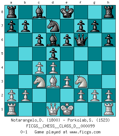Last move : 0-1 2008 November 11 8:49:7 [Event "FICGS__CHESS__CLASS_D__000099"] [Site "FICGS"] [Date "2008.08.23"] [Round "1"] [White "Notarangelo,Domenico"] [Black "Porkolab,Sandor"] [Result "0-1"] [WhiteElo "1800"] [BlackElo "1523"] 1.d4 d5 2.c4 c6 3.Nf3 Nf6 4.Nc3 e6 5.Bg5 h6 6.Bxf6 Qxf6 7.e3 Nd7 8.Bd3 Bd6 0-1 This chess game has been lost on time (started : 2008.08.23 22:51:53) QGD Slav : 4.Nc3 Player Black won this chess game. Follow this game move after move (download)Of Chess it has been said that life is not long enough for it, but that is the fault of life, not Chess. (William Ewart Napier) Ich kenne Menschen, die allen Willen der Welt besitzen und doch nicht Schach spielen können. (Robert James Fischer) El jugador de combinación piensa hacia adelante; comienza de la posición dada y trabaja las movidas contundentes en su mente. (Emanuel Lasker) Le succès, c'est être capable d'aller d'échec en échec sans perdre son enthousiasme. (Winston Churchill) I take risks, sometimes patients die, but not taking risks causes more patients to die. So I guess my biggest problem is I've been cursed with the ability to do the math. (Gregory House, House M.D.)