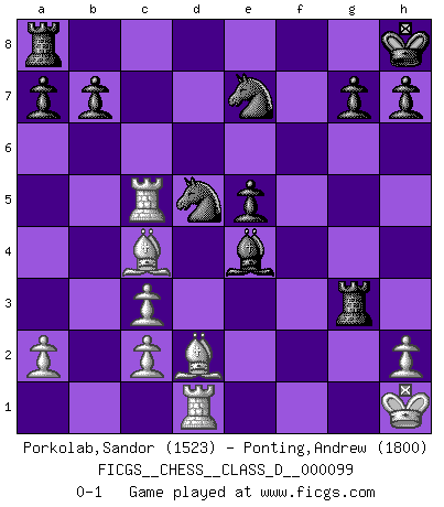 Last move : 0-1 2008 December 11 21:0:44 [Event "FICGS__CHESS__CLASS_D__000099"] [Site "FICGS"] [Date "2008.08.23"] [Round "1"] [White "Porkolab,Sandor"] [Black "Ponting,Andrew"] [Result "0-1"] [WhiteElo "1523"] [BlackElo "1800"] 1.e4 c5 2.Nf3 Nc6 3.d4 cxd4 4.Nxd4 Nf6 5.Nc3 e5 6.Nb3 Bb4 7.Bd3 d5 8.exd5 Nxd5 9.Bd2 Bxc3 10.bxc3 O-O 11.O-O f5 12.Bc4 Kh8 13.Qh5 Be6 14.Rfd1 Qc7 15.Nc5 Bf7 16.Qxf5 Nce7 17.Ne6 Bxe6 18.Qd3 Qc5 19.Rab1 Rxf2 20.Kh1 Bf5 21.Qg3 Be4 22.Rb5 Rxg2 23.Rxc5 Rxg3 0-1 Sicilian : Pelikan (Lasker/Sveshnikov) variation Kingside Castling by player Black (move 10) Kingside Castling by player White (move 11) Player Black won this chess game. Follow this game move after move (download)I like the moment when I break a man's ego. (Bobby Fischer) Ich würde mich als ganz normalen Jungen bezeichnen [Im Alter von 12]. (Sergej Karjakin) Alguna parte de un error es siempre correcto. (Savielly Tartakover) Avec des compensations pour le matériel en plus... (Anonyme) First of all, we have to go back to the classical time control. (Anatoly Karpov)