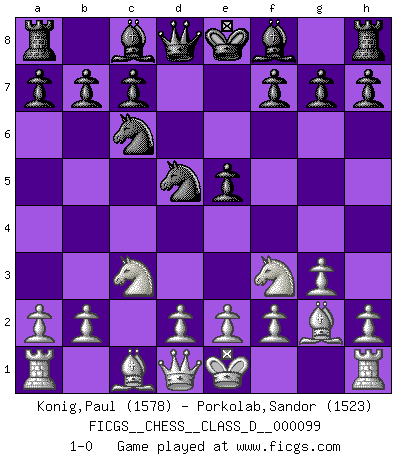 Last move : 1-0 2008 October 24 12:36:58 [Event "FICGS__CHESS__CLASS_D__000099"] [Site "FICGS"] [Date "2008.08.23"] [Round "1"] [White "Konig,Paul"] [Black "Porkolab,Sandor"] [Result "1-0"] [WhiteElo "1578"] [BlackElo "1523"] 1.c4 e5 2.Nc3 Nf6 3.Nf3 Nc6 4.g3 d5 5.cxd5 Nxd5 6.Bg2 1-0 This chess game has been lost on time (started : 2008.08.23 22:51:53) English Opening Player White won this chess game. Follow this game move after move (download)Many Chess players were surprised when after the game, Fischer quietly explained: 'I had already analyzed this possibility' in a position which I thought was not possible to foresee from the opening. (Mikhail Tal) Ein Isolani verdüstert die Stimmung auf dem ganzen Schachbrett. (Savielly Grigorievitsch Tartakower) El Ajedrez es 99 por ciento táctica. (Teichmann) Le jeu d'échecs est comme rejeté hors du temps. (Antoine de Saint-Exupéry) The right perception of any matter and a misunderstanding of the same matter do not wholly exclude each other. (Kafka's the trial)