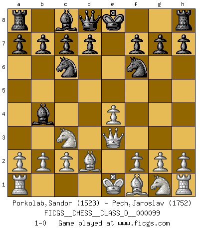 Last move : 1-0 2008 November 18 21:25:30 [Event "FICGS__CHESS__CLASS_D__000099"] [Site "FICGS"] [Date "2008.08.23"] [Round "1"] [White "Porkolab,Sandor"] [Black "Pech,Jaroslav"] [Result "1-0"] [WhiteElo "1523"] [BlackElo "1752"] 1.e4 e5 2.d4 exd4 3.Qxd4 Nc6 4.Qe3 Nf6 5.Nc3 Bb4 6.Bd2 1-0 This chess game has been lost on time (started : 2008.08.23 22:51:53) Centre game : Berger variation Player White won this chess game. Follow this game move after move (download)It's just you and your opponent at the board and you're trying to prove something. (Bobby Fischer) Darum geht es im Schach. Einen Tag gibst du deinem Gegner eine Lektion, am nächsten Tag gibt er dir eine. (Robert James Fischer) El Ajedrez es una guerra en un tablero. El objetivo es aplastar la mente del oponente. (Bobby Fischer) Que feriez-vous si vous étiez en train de jouer aux échecs et que la fin du monde arrive ? Je continuerais à jouer. (Saint Borromée) Think like a man of action, act like a man of thought. (Henri Louis Bergson)