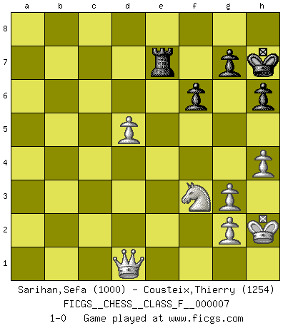 Last move : 1-0 2006 September 13 7:34:34 [Event "FICGS__CHESS__CLASS_F__000007"] [Site "FICGS"] [Date "2006.08.02"] [Round "1"] [White "Sarihan,Sefa"] [Black "Cousteix,Thierry"] [Result "1-0"] [WhiteElo "1000"] [BlackElo "1254"] 1.e4 e6 2.d4 d5 3.exd5 exd5 4.Bd3 Nc6 5.c3 Nf6 6.Ne2 Bd6 7.Bg5 O-O 8.Nd2 Re8 9.Bxf6 Qxf6 10.O-O Qh6 11.Ng3 Ne7 12.Nf3 Bxg3 13.fxg3 Bg4 14.Qb3 b6 15.Rae1 Be6 16.Ne5 Rab8 17.Rf4 f6 18.Nf3 Ng6 19.Bxg6 Qxg6 20.Qb5 c6 21.Qxc6 Qd3 22.Rxe6 Qb1+ 23.Ne1 Rxe6 24.Qxe6+ Kh8 25.Rf2 Qxa2 26.Re2 h6 27.Nd3 Qb1+ 28.Ne1 a5 29.h4 a4 30.Qxd5 b5 31.Kh2 Qg6 32.Nf3 b4 33.cxb4 Rxb4 34.Qd8+ Kh7 35.Re8 Qxe8 36.Qxe8 Rxb2 37.Qxa4 Re2 38.Qd1 Re7 39.d5 1-0 French : Exchange variation Kingside Castling by player Black (move 7) Kingside Castling by player White (move 10) Player White won this chess game. Follow this game move after move (download)Some sacrifices are sound; the rest are mine. (Mikhail Tal) Man gibt nur Pakete auf. (Paul Keres) Durante una competencia de Ajedrez, un Maestro de Ajedrez deberá ser una combinación de presa de caza y un Monge. (Alexander Alekhine) Les ravages du H expliquent la différence de niveau entre Tal et Thal [Abergel]. I find your interest interesting. (Gregory House, House M.D.)