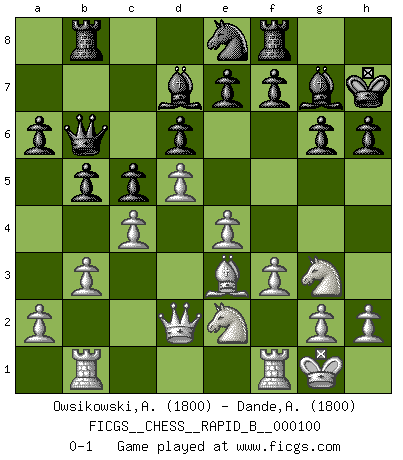 Last move : 0-1 2008 October 18 12:12:18 [Event "FICGS__CHESS__RAPID_B__000100"] [Site "FICGS"] [Date "2008.08.24"] [Round "1"] [White "Owsikowski,Andrzej"] [Black "Dande,Animish"] [Result "0-1"] [WhiteElo "1800"] [BlackElo "1800"] 1.d4 Nf6 2.c4 g6 3.Nc3 Bg7 4.e4 d6 5.f3 O-O 6.Be3 Nbd7 7.Qd2 c5 8.d5 a6 9.Bd3 Rb8 10.Nge2 Ne5 11.O-O Nxd3 12.Qxd3 Bd7 13.Rab1 b5 14.b3 h6 15.Qd2 Kh7 16.Ng3 Ne8 17.Nce2 Qb6 0-1 This chess game has been lost on time (started : 2008.08.24 15:8:30) King's Indian : Saemisch, 5...O-O Kingside Castling by player Black (move 5) Kingside Castling by player White (move 11) Player Black won this chess game. Follow this game move after move (download)The Pawns are the soul of the game. (Francois Andre Danican Philidor) Ich rechne überhaupt nicht voraus. Ich gewinne auch so. (Robert James Fischer) El Ajedrez es un terrible juego. Si no controlas el centro, tu oponente tiene una posición mas holgada. Si tienes control del centro, ¡entonces realmente tu tienes algo de que preocuparte!. (Siegbert Tarrasch) Psychologiquement, tu dois avoir confiance en toi même, mais cette confiance doit être basée sur des faits. (Robert Fischer) Do you know these so called Volunteers don't even get paid! (Simpsons)