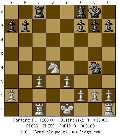 Last move : 1-0 2008 October 16 11:34:4 [Event "FICGS__CHESS__RAPID_B__000100"] [Site "FICGS"] [Date "2008.08.24"] [Round "1"] [White "Ponting,Andrew"] [Black "Owsikowski,Andrzej"] [Result "1-0"] [WhiteElo "1800"] [BlackElo "1800"] 1.d4 d5 2.c4 e6 3.Nf3 Nf6 4.Nc3 c5 5.cxd5 exd5 6.Bg5 Be7 7.dxc5 O-O 8.e3 Bxc5 9.Bxf6 Qxf6 10.Qxd5 Bb4 11.Qe5 Bxc3+ 12.Qxc3 Qxc3+ 13.bxc3 Nc6 14.Bd3 Bg4 15.Nd4 Ne5 16.Be2 Rac8 17.Bxg4 Nxg4 18.Rc1 1-0 This chess game has been lost on time (started : 2008.08.24 15:8:30) Queen's gambit declined Kingside Castling by player Black (move 7) Player White won this chess game. Follow this game move after move (download)We don't really know how the game was invented, though there are suspicions. As soon as we discover the culprits, we'll let you know. (Bruce Pandolfini) Ich brauche nur einen Blick auf das Schachbrett zu werfen, und weiß schon, was in der Stellung steckt, was geschehen kann und was geschehen wird. Alle übrigen suchen und prüfen, ich aber weiß es! (José Raúl Capablanca) El jugador de combinación piensa hacia adelante; comienza de la posición dada y trabaja las movidas contundentes en su mente. (Emanuel Lasker) Il vaut toujours mieux jouer un plan faux de façon logique que de n'avoir pas de plan du tout. (Victor Kortchnoï) Unless in communicating with it one says exactly what one means, trouble is bound to result. (Alan Turing, about computers)