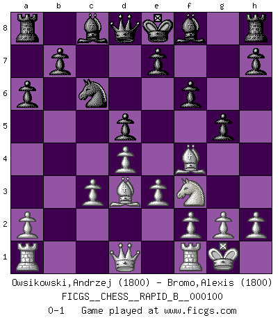 Last move : 0-1 2008 October 6 10:48:45 [Event "FICGS__CHESS__RAPID_B__000100"] [Site "FICGS"] [Date "2008.08.24"] [Round "1"] [White "Owsikowski,Andrzej"] [Black "Bromo,Alexis"] [Result "0-1"] [WhiteElo "1800"] [BlackElo "1800"] 1.d4 d5 2.c4 c6 3.cxd5 cxd5 4.Nc3 Nf6 5.Nf3 Nc6 6.Bf4 Ne4 7.e3 f6 8.Bd3 Nxc3 9.bxc3 a6 10.O-O g5 0-1 This chess game has been lost on time (started : 2008.08.24 15:8:30) QGD Slav defense : Exchange variation Kingside Castling by player White (move 10) Player Black won this chess game. Follow this game move after move (download)Fischer is the strongest player in the world. In fact, the strongest player who ever lived. (Larry Evans) Wie bekannt hörte Morphy 1859 auf, Schach zu spielen. Seine Enttäuschung galt nicht so sehr dem Schach, wie den Schachspielern. (Robert James Fischer) La pasion por jugar al Ajedrez es una de las mas inexplicables en el mundo. (H.G. Wells) Les échecs sont plus proches de l'art de l'assassinat que de l'art de la guerre. (Arturo Perez-Reverte) Whoever said the pen is mightier than the sword obviously never encountered automatic weapons. (US General Douglas MacArthur)