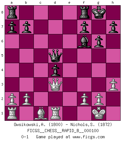 Last move : 0-1 2008 October 12 11:18:50 [Event "FICGS__CHESS__RAPID_B__000100"] [Site "FICGS"] [Date "2008.08.24"] [Round "1"] [White "Owsikowski,Andrzej"] [Black "Nichols,Scott"] [Result "0-1"] [WhiteElo "1800"] [BlackElo "1872"] 1.d4 Nf6 2.c4 g6 3.Nc3 d5 4.e3 c6 5.Nf3 Bg7 6.Bd3 O-O 7.O-O Bg4 8.h3 Bxf3 9.Qxf3 e6 10.Rd1 Nbd7 11.e4 e5 12.exd5 exd4 13.Ne4 Ne5 14.Nxf6+ Bxf6 15.Qe2 cxd5 16.cxd5 Nxd3 17.Qxd3 Qxd5 0-1 This chess game has been lost on time (started : 2008.08.24 15:8:30) King's Indian defense, 3.Nc3 Kingside Castling by player Black (move 6) Kingside Castling by player White (move 7) Player Black won this chess game. Follow this game move after move (download)All I want to do, ever, is just play Chess. (Bobby Fischer) Kritik überlasse ich den Spießern. Ich zeige nichts, wofür ich mich schämen muss. (Alexandra Kosteniuk) Alguna parte de un error es siempre correcto. (Savielly Tartakover) Je crois qu'il existe des manières très spécifiques de jouer efficacement contre une machine. Evidemment, nous n'avons aucune chance en technique pure, parce que l'ordinateur calcule de manière parfaite. Mais lorsque nous faisons appel à notre cerveau, en utilisant l'intuition et la compréhension, alors nous restons beaucoup plus forts. (Anatoli Karpov) My poor ole parrot... Is not in the circulation of displays ....poo hoo hoo :) (Wayne Lowrance's enigma)