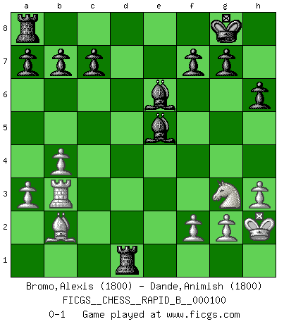 Last move : 0-1 2008 August 25 15:58:3 [Event "FICGS__CHESS__RAPID_B__000100"] [Site "FICGS"] [Date "2008.08.24"] [Round "1"] [White "Bromo,Alexis"] [Black "Dande,Animish"] [Result "0-1"] [WhiteElo "1800"] [BlackElo "1800"] 1.e4 e5 2.Nf3 Nc6 3.Bc4 Nf6 4.O-O d5 5.exd5 Nxd5 6.Bxd5 Qxd5 7.Re1 Be7 8.Nc3 Qa5 9.a3 O-O 10.d4 Nxd4 11.Nxd4 exd4 12.Qxd4 Be6 13.b4 Qf5 14.Ne4 h6 15.Bb2 Qg6 16.Re3 Bh4 17.Ng3 Bf6 18.Re5 Qxc2 19.Rc1 Qb3 20.h3 Rfd8 21.Rc3 Rxd4 22.Rxb3 Rd1+ 23.Kh2 Bxe5 0-1 Two knights defense Kingside Castling by player White (move 4) Kingside Castling by player Black (move 9) Player Black won this chess game. Follow this game move after move (download)A Chess game is a dialogue, a conversation between a player and his opponent. Each move by the opponent may contain threats or be a blunder, but a player cannot defend against threats or take advantage of blunders if he does not first ask himself: What is my opponent planning after each move ? (Bruce A. Moon) Aljechin war kein Nazi. Er war ein Opportunist. Ein schrecklicher Mann. Er liebte Geld über alles und würde für Geld ein Jude, ein Katolik oder ein Protestant werden. (Miguel Najdorf) Preferería tener un Peón que un dedo. (Reuben Fine) Le succès, c'est être capable d'aller d'échec en échec sans perdre son enthousiasme. (Winston Churchill) You know what they say : You lie down with the Devil, you wake up in Hell. (Horatio Caine, C.S.I. Miami)