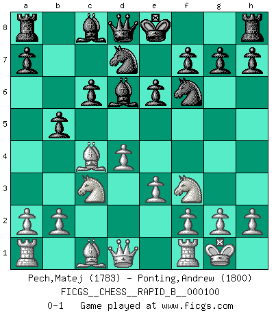 Last move : 0-1 2008 October 20 0:18:13 [Event "FICGS__CHESS__RAPID_B__000100"] [Site "FICGS"] [Date "2008.08.24"] [Round "1"] [White "Pech,Matej"] [Black "Ponting,Andrew"] [Result "0-1"] [WhiteElo "1783"] [BlackElo "1800"] 1.c4 c6 2.Nc3 d5 3.d4 Nf6 4.Nf3 e6 5.e3 Nbd7 6.Bd3 dxc4 7.Bxc4 Bd6 8.O-O b5 0-1 This chess game has been lost on time (started : 2008.08.24 15:8:30) English : Caro-Kann defensive system Kingside Castling by player White (move 8) Player Black won this chess game. Follow this game move after move (download)It is not a move, even the best move that you must seek, but a realizable plan. (Eugene Znosko-Borovsky) Ich bin stolz ein Bulgare zu sein. (Veselin Topalov) Uno no tiene que jugar muy bien, es suficiente jugar mejor que el oponente. (Siegbert Tarrasch) Roi des jeux et jeu des rois, les échecs portent en eux un sentiment d'infini. Ils donnent à celui qui s'est efforcé d'en approfondir les arcanes l'impression de n'être pas à la mesure de l'homme; en fait, ils constituent un résumé de l'univers, un microcosme, et figurent cette grande échelle qui, dans les plans de la lumière descend jusqu'à la matière, qui des abîmes insondables remonte jusqu'en l'infini de Dieu. (Pyrame) It is a good thing for an uneducated man to read books of quotations. (Winston Churchill)