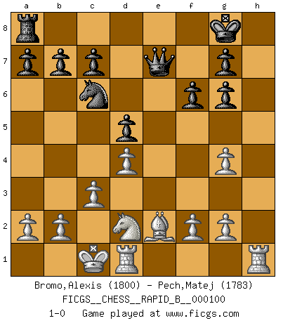 Last move : 1-0 2008 October 12 11:18:50 [Event "FICGS__CHESS__RAPID_B__000100"] [Site "FICGS"] [Date "2008.08.24"] [Round "1"] [White "Bromo,Alexis"] [Black "Pech,Matej"] [Result "1-0"] [WhiteElo "1800"] [BlackElo "1783"] 1.e4 e6 2.d4 d5 3.exd5 exd5 4.Qe2+ Be7 5.Bg5 Nc6 6.Nf3 Bg4 7.Bxe7 Ngxe7 8.c3 O-O 9.h3 Re8 10.hxg4 Ng6 11.Ne5 f6 12.Nxg6 hxg6 13.Nd2 Rxe2+ 14.Bxe2 Qe7 15.O-O-O 1-0 This chess game has been lost on time (started : 2008.08.24 15:8:30) French : Exchange variation Kingside Castling by player Black (move 8) Queenside Castling by player White (move 15) Player White won this chess game. Follow this game move after move (download)Of all my Russian books, the defense contains and diffuses the greatest 'warmth' which may seem odd seeing how supremely abstract Chess is supposed to be. (Vladimir Nabokov) Die westlichen Werte sind eine Sprache, welche die Putin-Administration nicht versteht. (Garry Kasparov) El Ajedrez se juega con la mente... ¡no con las manos!. (Renaud y Kahn) La conception d'un plan est le processus par lequel un joueur exploite les avantages de sa position tout en s'efforçant d'en réduire au minimum les inconvénients. Afin de garantir le succès, un plan doit toujours se fonder sur un diagnostic objectif des particularités d'une position. La conception d'un plan est d'autant plus difficile que la position est équilibrée, et grandement facilitée lorsqu'il n'existe qu'un seul plan susceptible de répondre aux exigences de la position. (Harry Golombek) In God we trust, all others we virus scan. (Anonymous)