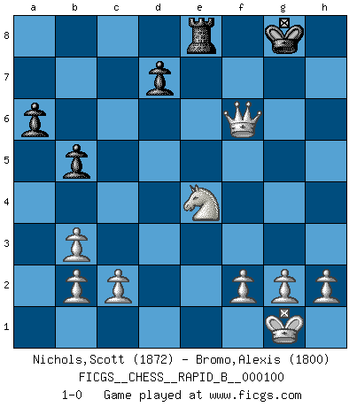 Last move : 1-0 2008 August 28 13:57:10 [Event "FICGS__CHESS__RAPID_B__000100"] [Site "FICGS"] [Date "2008.08.24"] [Round "1"] [White "Nichols,Scott"] [Black "Bromo,Alexis"] [Result "1-0"] [WhiteElo "1872"] [BlackElo "1800"] 1.e4 c5 2.Nf3 Nc6 3.d4 cxd4 4.Nxd4 e5 5.Nb5 a6 6.Nd6+ Bxd6 7.Qxd6 Nge7 8.Bc4 O-O 9.O-O b5 10.Bb3 Bb7 11.Rd1 Nd4 12.Nc3 Nc8 13.Qxe5 Nxb3 14.axb3 Re8 15.Qd4 Nb6 16.Bf4 h6 17.Rd3 Qe7 18.Rg3 g5 19.Qxb6 Bxe4 20.Re1 Qb4 21.Qxh6 Bg6 22.Be5 Rxe5 23.Rxe5 Qd6 24.Rexg5 Re8 25.Rxg6+ Qxg6 26.Rxg6+ fxg6 27.Qxg6+ Kf8 28.Qf6+ Kg8 29.Ne4 1-0 Sicilian : Labourdonnais-Loewenthal variation Kingside Castling by player Black (move 8) Kingside Castling by player White (move 9) Player White won this chess game. Follow this game move after move (download)He who fears an isolated Queen's Pawn should give up Chess. (Siegbert Tarrasch) Das Zentrum ist der Balkan des Schachbretts - Kriegshandlungen können in jedem Moment ausbrechen. (Aaron Nimzowitsch) El Ajedrez es un expediente tonto que hace creer a la gente inactiva que hacen una cosa muy astuta cuando solamente estan perdiendo su tiempo. (George Bernard Shaw) Il s'avisa de me proposer d'apprendre les échecs qu'il jouait un peu... me voilà forcené des échecs. J'achète un échiquier, je m'enferme dans ma chambre, j'y passe des jours et des nuits à vouloir apprendre par cœur toutes les parties. (Jean-Jacques Rousseau, Confessions) Empty your mind, be formless, shapeless — like water. (Bruce Lee)