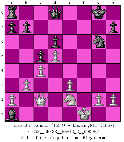 Last move : 0-1 2008 August 30 16:51:50 [Event "FICGS__CHESS__RAPID_C__000057"] [Site "FICGS"] [Date "2008.08.24"] [Round "1"] [White "Kepinski,Janusz"] [Black "Dadban,Ali"] [Result "0-1"] [WhiteElo "1657"] [BlackElo "1657"] 1.d4 d6 2.c4 e5 3.e3 Nc6 4.b3 g6 5.d5 Nce7 6.Bd3 Bg7 7.Bb2 f5 8.Ne2 Nf6 9.O-O O-O 10.Nbc3 c5 11.Qc2 e4 12.Bxe4 fxe4 13.Nxe4 Bf5 14.f3 Nxe4 15.fxe4 Bxb2 16.exf5 Bxa1 17.fxg6 Rxf1+ 18.Kxf1 Nxg6 0-1 Old Indian defense Kingside Castling by player White (move 9) Kingside Castling by player Black (move 9) Player Black won this chess game. Follow this game move after move (download)Half the variations which are calculated in a tournament game turn out to be completely superfluous. Unfortunately, no one knows in advance which half. (Jan Tinman) Wenn Du absolut nicht mehr weißt, was Du tun sollst, dann ist es Zeit für Panik. (John van der Wiel) El Ajedrez no es como la vida... ¡tiene reglas!. (Mark Pasternak) Il n'y a pas de prix trop élevé au scalp de l'ennemi. (Koblentz) I'm extremely disappointed. I send you out for exciting, new designer drugs, you come back with tomato sauce. (Gregory House, House M.D.)