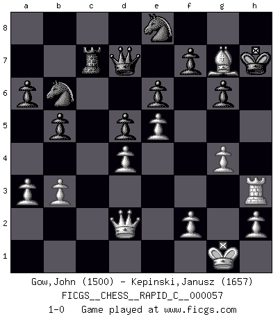 Last move : 1-0 2008 September 5 19:59:18 [Event "FICGS__CHESS__RAPID_C__000057"] [Site "FICGS"] [Date "2008.08.24"] [Round "1"] [White "Gow,John"] [Black "Kepinski,Janusz"] [Result "1-0"] [WhiteElo "1500"] [BlackElo "1657"] 1.e4 e6 2.d4 d5 3.e5 b6 4.c3 Bd7 5.Nf3 c5 6.Be2 cxd4 7.cxd4 Ne7 8.O-O g6 9.Bf4 Nf5 10.g4 Ng7 11.Qb3 Be7 12.Bh6 O-O 13.Bb5 Bxb5 14.Qxb5 Nd7 15.Nbd2 Re8 16.Rac1 a6 17.Qd3 b5 18.Rfe1 Bb4 19.a3 Bxd2 20.Qxd2 Nb6 21.b3 Qd7 22.Re3 Rec8 23.Ng5 Rxc1+ 24.Qxc1 Rc8 25.Qd2 Rc7 26.Rh3 Ne8 27.Nxh7 Kxh7 28.Bg7 1-0 French : Advance variation Kingside Castling by player White (move 8) Kingside Castling by player Black (move 12) Player White won this chess game. Follow this game move after move (download)Modern Chess is too much concerned with things like Pawn structure. Forget it, Checkmate ends the game. (Nigel Short) Wenn Schach ein enormer Dschungel ist, der seine Myriaden von Geheimnissen nicht preisgeben will, dann sind Computer die Kettensägen einer gewaltigen ökologisch unsensiblen Nutzholzfirma. (Nigel Short) Los Peones son nacidos libres, y aún así, se encuentran encadenados por todos lados. (Rick Kennedy) Les Echecs représentent une sphère d'idées créatrices basée sur la volonté des deux protagonistes. (Smyslov) Big Chess is a place for big hallucinations. (Thibault de Vassal)