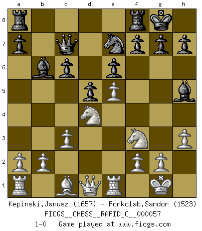 Last move : 1-0 2008 October 16 11:34:4 [Event "FICGS__CHESS__RAPID_C__000057"] [Site "FICGS"] [Date "2008.08.24"] [Round "1"] [White "Kepinski,Janusz"] [Black "Porkolab,Sandor"] [Result "1-0"] [WhiteElo "1657"] [BlackElo "1523"] 1.e4 d5 2.e5 c5 3.c3 Nc6 4.Nf3 Bg4 5.Bb5 e6 6.d4 Qb6 7.Bxc6+ bxc6 8.dxc5 Bxc5 9.O-O Qc7 10.Re1 Ne7 11.Nbd2 O-O 12.Nb3 Bb6 13.h3 Bh5 14.Nbd4 1-0 This chess game has been lost on time (started : 2008.08.24 20:54:38) Scandinavian (centre counter) defense Kingside Castling by player White (move 9) Kingside Castling by player Black (move 11) Player White won this chess game. Follow this game move after move (download)Up to this point White has been following well-known analysis. But now he makes a fatal error: he begins to use his own head. (Siegbert Tarrasch) Das Schachspiel hat wie die Liebe, die Musik, die Fähigkeit, den Menschen glücklich zu machen. Ich habe ein leises Gefühl des Bedauerns für jeden, der das Schachspiel nicht kennt, so wie ich jeden bedaure, der die Liebe nicht kennt. (Siegbert Tarrasch) Cuando tengas duda... ¡juega al Ajedrez!. (Tevis) Les Echecs ont trois composantes : le temps, l'espace et le matériel en dernier. (Mikhail Tal) Luck is when opportunity knocks and you answer. (Anonymous)