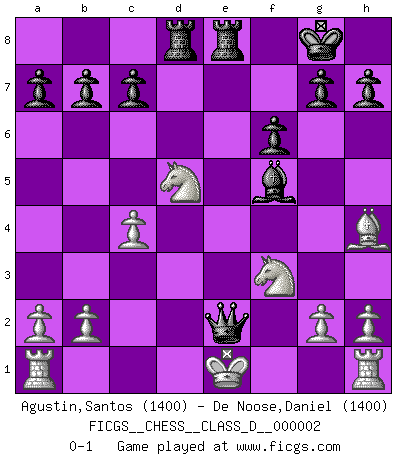Last move : 0-1 2006 July 15 11:6:37 [Event "FICGS__CHESS__CLASS_D__000002"] [Site "FICGS"] [Date "2006.04.15"] [Round "1"] [White "Agustin,Santos"] [Black "De Noose,Daniel"] [Result "0-1"] [WhiteElo "1400"] [BlackElo "1400"] 1.d4 Nf6 2.c4 e5 3.dxe5 Ng4 4.Qd4 d6 5.exd6 Bxd6 6.Nf3 O-O 7.Bg5 Qe8 8.Nc3 f6 9.Bh4 Nc6 10.Qd2 Bf5 11.e3 Rd8 12.Nd5 Bb4 13.Qxb4 Nxb4 14.Nxb4 Nxe3 15.fxe3 Qxe3+ 16.Be2 Rfe8 17.Nd5 Qxe2+ 0-1 Budapest defense Kingside Castling by player Black (move 6) Player Black won this chess game. Follow this game move after move (download)Methodical thinking is of more use in Chess than inspiration. (C. J. S. Purdy) Der Traum, für den ich lebe, ist der von einem freien Russland. Viele mögen sagen: Russland hat doch ein Parlament, einen gewählten Präsidenten. Aber ich spüre, dass in meiner Heimat die Angst wiederkehrt. Eine Angst, sich frei zu äußern, bestimmte Dinge zu tun (Garry Kasparov) Los Peones son el alma de una partida de Ajedrez. (Francois Andre Danican Philidor) Un journaliste : 'Vous préférez avoir une dame de plus sur l'échiquier ou au lit ?' Boris Spassky : 'Ca dépend de la position.' The best teachers teach from the heart, not from the book. (Author unknown)