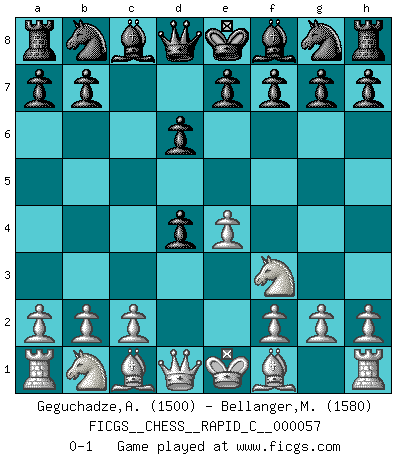 Last move : 0-1 2008 October 4 22:44:16 [Event "FICGS__CHESS__RAPID_C__000057"] [Site "FICGS"] [Date "2008.08.24"] [Round "1"] [White "Geguchadze,Alexander"] [Black "Bellanger,Michel"] [Result "0-1"] [WhiteElo "1500"] [BlackElo "1580"] 1.e4 c5 2.Nf3 d6 3.d4 cxd4 0-1 This chess game has been lost on time (started : 2008.08.24 20:54:38) Sicilian Player Black won this chess game. Follow this game move after move (download)The tactician must know what to do whenever something needs doing; the strategist must know what to do when nothing needs doing. (Savielly Tartakover) Was ist der Unterschied zwischen einem Strassenarbeiter und einem Schachspieler? --Der Schachspieler bewegt sich ab und zu. (Anonymous) Todo se encuentra en un estado de flujo y esto incluye al mundo del Ajedrez. (Mikhail Botvinnik) Soyez une menace à chaque fois que vous vous asseyez pour jouer. (Ken Smith) It is not enough to be a good player... you must also play well. (Siegbert Tarrasch)