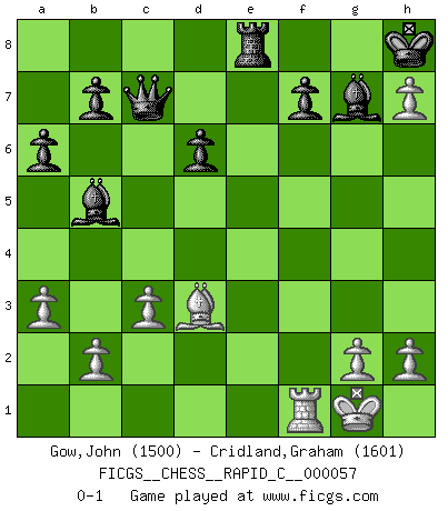Last move : 0-1 2008 October 23 19:44:31 [Event "FICGS__CHESS__RAPID_C__000057"] [Site "FICGS"] [Date "2008.08.24"] [Round "1"] [White "Gow,John"] [Black "Cridland,Graham"] [Result "0-1"] [WhiteElo "1500"] [BlackElo "1601"] 1.e4 c5 2.Nf3 d6 3.d4 cxd4 4.Nxd4 Nf6 5.Nc3 e6 6.Be3 Nc6 7.Bb5 Qc7 8.O-O Be7 9.Qf3 O-O 10.Qg3 Ne5 11.Bh6 Ng6 12.Bf4 Nxf4 13.Nf5 exf5 14.Qxf4 fxe4 15.Nxe4 Nxe4 16.Qxe4 Be6 17.Bd3 g6 18.Rfe1 Bf6 19.Qb4 Rac8 20.c3 Rfe8 21.a3 Be5 22.f4 Bg7 23.Qa4 a6 24.f5 Bd7 25.Rxe8+ Rxe8 26.fxg6 Bxa4 27.gxh7+ Kh8 28.Rf1 Bb5 0-1 Sicilian : Scheveningen variation Kingside Castling by player White (move 8) Kingside Castling by player Black (move 9) Player Black won this chess game. Follow this game move after move (download)It's always better to sacrifice your opponent's men. (Savielly Tartakover) Das Schach hält seine Meister in eigenen Banden, Fesseln; auf vielerlei Weise formt es ihren Geist, so dass die innere Freiheit selbst des Stärksten beeinflusst wird. (Albert Einstein) Solo puedes ser bueno en el Ajedrez si amas al juego. (Bobby Fischer) Des combinaisons [dans le jeu d'échecs] pareilles à des mélodies. Je crois entendre pour ainsi dire la musique des coups... (Vladimir Nabokov) The next best thing to gambling and winning is gambling and loosing. (Nick Dandalos)