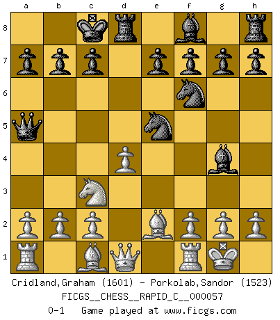 Last move : 0-1 2008 September 17 2:38:49 [Event "FICGS__CHESS__RAPID_C__000057"] [Site "FICGS"] [Date "2008.08.24"] [Round "1"] [White "Cridland,Graham"] [Black "Porkolab,Sandor"] [Result "0-1"] [WhiteElo "1601"] [BlackElo "1523"] 1.e4 d5 2.exd5 Qxd5 3.Nc3 Qa5 4.d4 Nf6 5.Nf3 Bg4 6.Be2 Nc6 7.O-O O-O-O 8.Ne5 Nxe5 0-1 Scandinavian (centre counter) defense Kingside Castling by player White (move 7) Queenside Castling by player Black (move 7) Player Black won this chess game. Follow this game move after move (download)My style is somewhere between that of Tal and Petrosian. (Reshevsky) Charakterschwächen offenbaren sich normalerweise während einer Schachpartie. (Garry Kasparov) Debes de llevar a tu oponente hacia un profundo y obscuro bosque donde 2+2=5, y el camino que conduce a la salida es suficientemente ancho para solamente uno. (Mikhail Tal) Si je n'étais pas joueur d'échecs, je serais le meilleur dans quelque chose d'autre. (Anatoli Karpov) In my experience, there's no such thing as luck. (Obi-Wan Kenobi in Star Wars ep.4)
