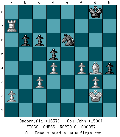 Last move : 1-0 2008 August 26 21:6:22 [Event "FICGS__CHESS__RAPID_C__000057"] [Site "FICGS"] [Date "2008.08.24"] [Round "1"] [White "Dadban,Ali"] [Black "Gow,John"] [Result "1-0"] [WhiteElo "1657"] [BlackElo "1500"] 1.d4 Nf6 2.c4 e6 3.Nf3 g6 4.Nc3 Bg7 5.e4 O-O 6.Bg5 h6 7.Bh4 g5 8.Bg3 d5 9.e5 Ne4 10.cxd5 Nxc3 11.bxc3 exd5 12.Bd3 Bg4 13.Qb3 b6 14.O-O f5 15.exf6 Rxf6 16.Ne5 Qd6 17.Nxg4 Rf4 18.Ne3 c6 19.Nf5 Qd8 20.Nxg7 Kxg7 21.Bxf4 gxf4 22.Qd1 Qg5 23.Qf3 Nd7 24.Rae1 Rf8 25.Re6 Rf6 26.Rfe1 Rxe6 27.Rxe6 Nf8 28.Re5 Qh4 29.g3 fxg3 30.hxg3 Qf6 31.Qg4+ Kh8 32.Kg2 Qd8 33.Qh5 Kg7 34.Qe2 Qf6 35.Re7+ Kg8 36.Rxa7 Qe6 37.Qxe6+ Nxe6 38.f4 h5 39.Be2 h4 40.Bg4 1-0 Queen's pawn game Kingside Castling by player Black (move 5) Kingside Castling by player White (move 14) Player White won this chess game. Follow this game move after move (download)Fischer prefers to enter Chess history alone. (Miguel Najdorf) Über Frauen: Chess is better. (Robert James Fischer) Repentinamente, me resultaba obvio en mi analisis que yo había pasado por alto lo que Fischer había visto en el tablero con la mas grande facilidad. (Mikhail Botvinnik) Roi des jeux et jeu des rois, les échecs portent en eux un sentiment d'infini. Ils donnent à celui qui s'est efforcé d'en approfondir les arcanes l'impression de n'être pas à la mesure de l'homme; en fait, ils constituent un résumé de l'univers, un microcosme, et figurent cette grande échelle qui, dans les plans de la lumière descend jusqu'à la matière, qui des abîmes insondables remonte jusqu'en l'infini de Dieu. (Pyrame) There are two kinds of tragedy in this world, one is not getting what you want and the other is getting. (Lord of war)