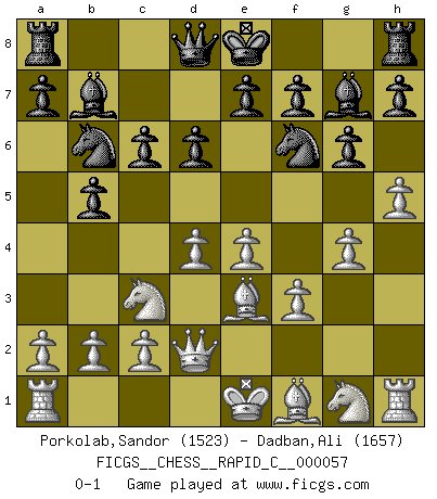 Last move : 0-1 2008 October 7 10:55:8 [Event "FICGS__CHESS__RAPID_C__000057"] [Site "FICGS"] [Date "2008.08.24"] [Round "1"] [White "Porkolab,Sandor"] [Black "Dadban,Ali"] [Result "0-1"] [WhiteElo "1523"] [BlackElo "1657"] 1.e4 d6 2.d4 Nf6 3.Nc3 g6 4.f3 c6 5.Be3 b5 6.Qd2 Bb7 7.g4 Nbd7 8.h4 Nb6 9.h5 Bg7 0-1 This chess game has been lost on time (started : 2008.08.24 20:54:38) Pirc defense Player Black won this chess game. Follow this game move after move (download)What would Chess be without silly mistakes ? (Kurt Richter) Ich verstehe mehr vom Schach als irgendein anderer lebender Meister. (José Raúl Capablanca) El Ajedrez demanda una total concentración. (Bobby Fischer) Le jeu d'échecs est comme rejeté hors du temps. (Antoine de Saint-Exupéry) The weakness of an artist is dogma. (Josh Waitzkin)